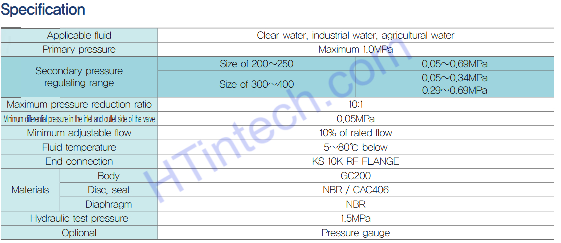 - Phạm vi điều chỉnh áp suất của van là: 0.05~0.69MPa (DN200-DN250) và 0.5~0.34MPa, 0.29 ~0.69MPa(DN300-DN400)