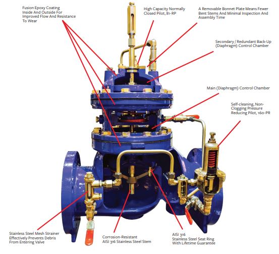áp suất xả thấp hơn ổn định, bất kể sự biến động của dòng chảy hoặc áp suất đầu vào. Nếu màng ngăn của điều khiển chính buồng bị hỏng khi xảy ra hỏa hoạn, buồng thứ cấp/dự phòng. Buồng điều khiển dự phòng (màng ngăn) sẽ đảm nhận việc kiểm soát áp lực hạ lưu.